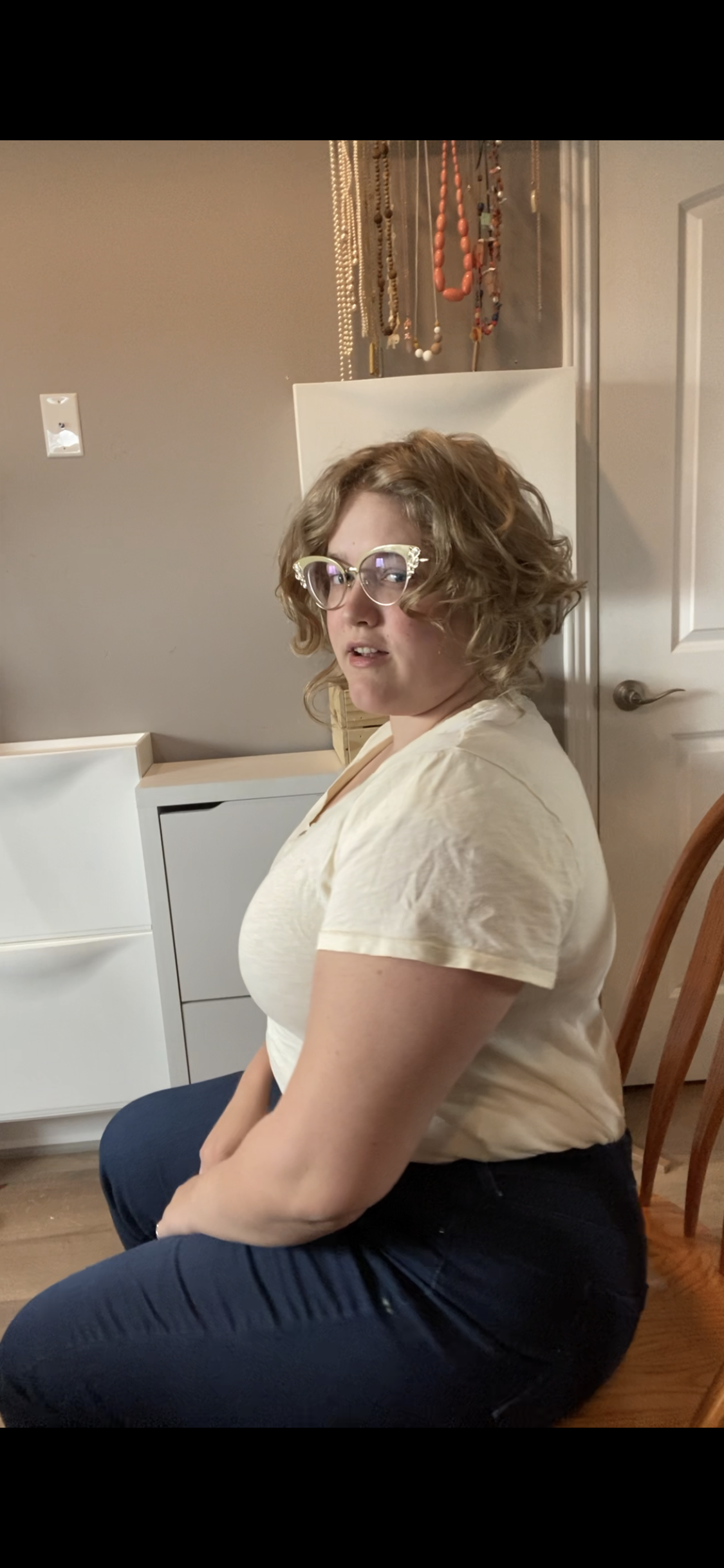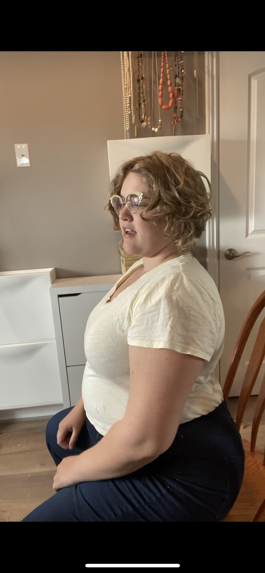 But recently, after several months in physical therapy, I have come to understand that what I have always thought of as sitting up straight is incorrect. Here is a picture of what felt like sitting up straight to me (apologies for the sneeze face. It was the best screenshot I could pull out of the video I made about this. I’m not actually sneezing, just mid sentence).